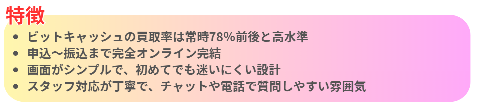 - ビットキャッシュ買取率:78%(初回・リピート共通)